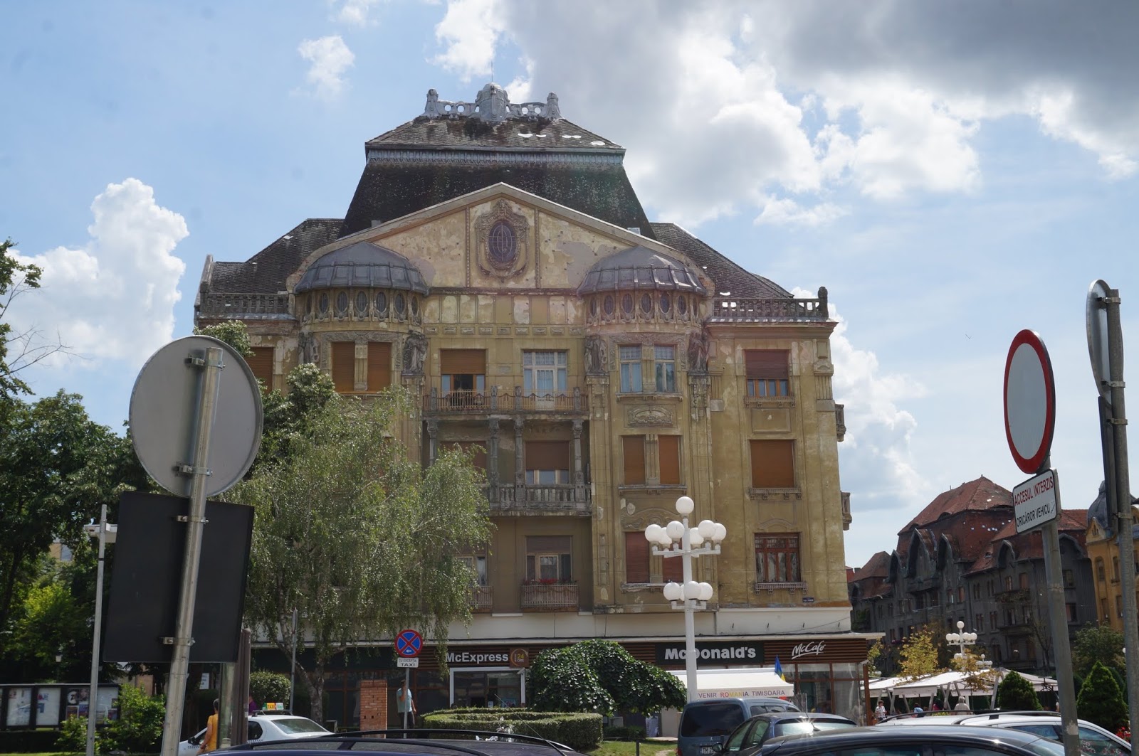 Today we walked around the old town of Timisoara. We slept in, then walked until we found a promising café for lunch. The heart of the old town does not have cars--it is all pedestrian. In fact, most of the bicycles I saw were being walked. The streets are