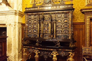 So after the history lesson, here's the castle! There is no parking area specifically for the castle. You can park on the street (like we did) for free if you can find a space, or you can pay to park in a lot. It was hard to find the entrance, we walked right by it the first time. Then it doesn't direct you where to go to get tickets, We saw a cluster of people near a building past the gift shop and sure enough, that was where the tickets were! No signs directing us there! Then you walk up to the castle and eventually you find the entrance. Once you are in the castle, there are arrows directing you up down and around and those are fairly clear and do a good job of helping you to see as much as possible of this castle. It is a rabbit warren of little rooms and loggias. I didn't like that the furniture didn't show what each room would have looked like. The furniture was old and from the family, but wasn't really set up to show how they lived in the house. But it was interesting.