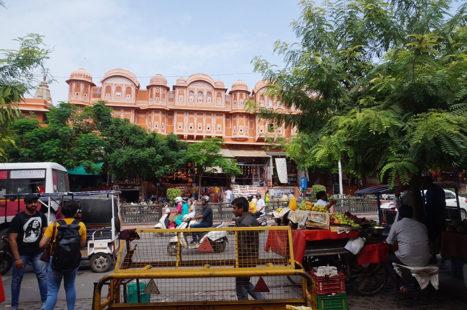 Next we walked to get water and food. On the way, we stopped to see the hawa mahal. It is a palace that was built for the royal women (the wives of the Maharaja's harem) to live. Others were not allowed to see them, so they could live here and see the street and festivals that would happen there without being seen.
